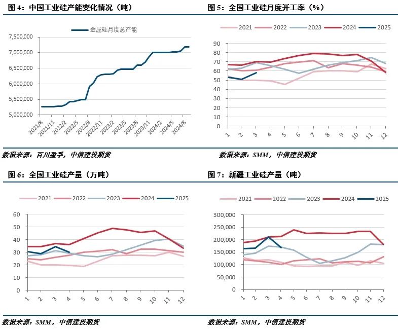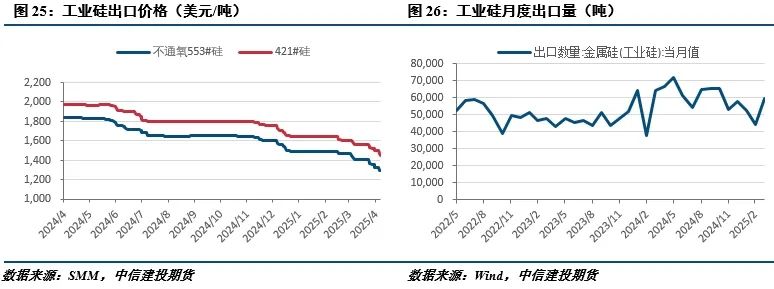需求情况:多晶硅价格延续跌价,下游采购持续观望,悲观向上传导,难对工业硅形成支撑;有机硅价格趋于平稳,终端需求仍然偏弱,单体厂减产持续,对工业硅需求偏弱;铝合金开工平稳,对工业硅刚需采购;工业硅3月出口同比下降,海外需求偏弱。
