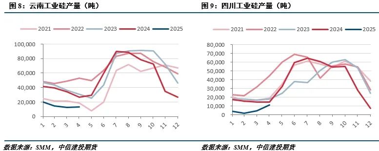 总结:工业硅期货再度触及新低,现货市场持续低迷,下游需求清淡而供应充足,市场总体仍显悲观。从供需来看,西北供应保持稳定,而西南丰水期临近开工有小幅增加迹象,不过由于行业亏损面持续扩大,丰水期西南开工或大幅不及往年,需求端多晶硅开工低位平稳,有机硅仍面临弱势终端需求,工业硅总体需求难有起色。总体来看,短期工业硅供需难有好转,高库存难以去化,工业硅期货或持续底部运行。操作上,观望为主,SI2506合约参考区间8300-8800元/吨。