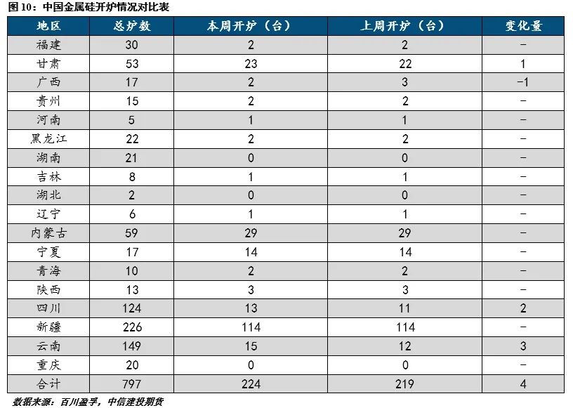 工业硅开炉数小幅上升,主因西南部分硅厂按计划开工,西北开工暂维持稳定。据百川盈孚数据,截止4月29日,我国金属硅开工炉数224台,整体开炉率28.11%,较上周增加5台。