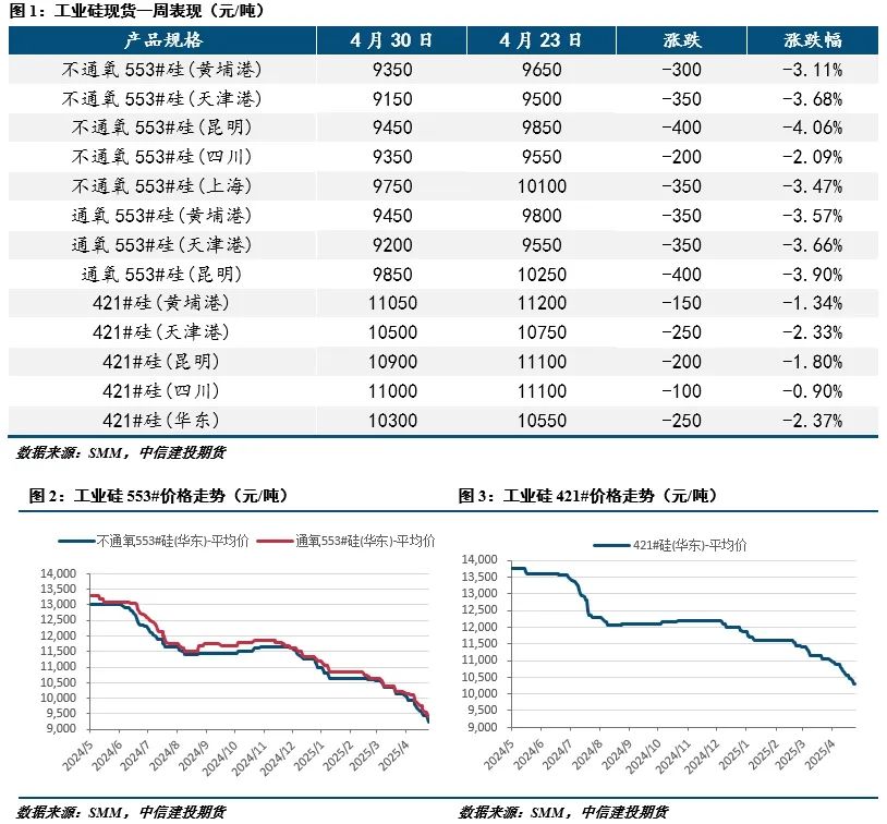 市场运行情况:五一节前一周仅三个交易日,市场维持低迷状态,价格进一步下探,市场悲观情绪难改善。SI2506整周涨跌幅-2.73%,收于8540元/吨。现货市场方面,五一节前备货需求未有明显体现,下游采购需求不足,叠加产业链下游也普遍呈跌价状态,压价心态较强,现货报价进一步走低。
